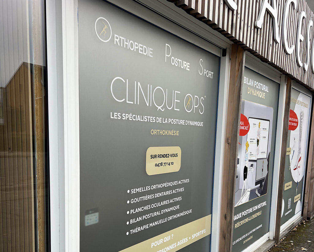 Pour la clinique OPS, nous avons imprimé et posé plusieurs vinyles pour l’habillage de ses trois grandes surfaces vitrées.