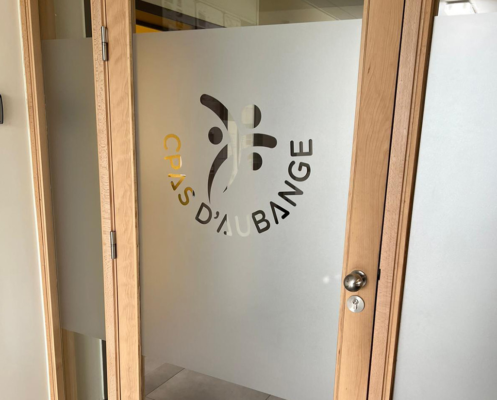 Pour le CPAS d’Aubange en Belgique, nous avons habillé les vitres de l’entrée avec des vinyles sablés. L’un d’eux intègre une découpe du logo, permettant de laisser passer la lumière tout en mettant en valeur leur identité visuelle.