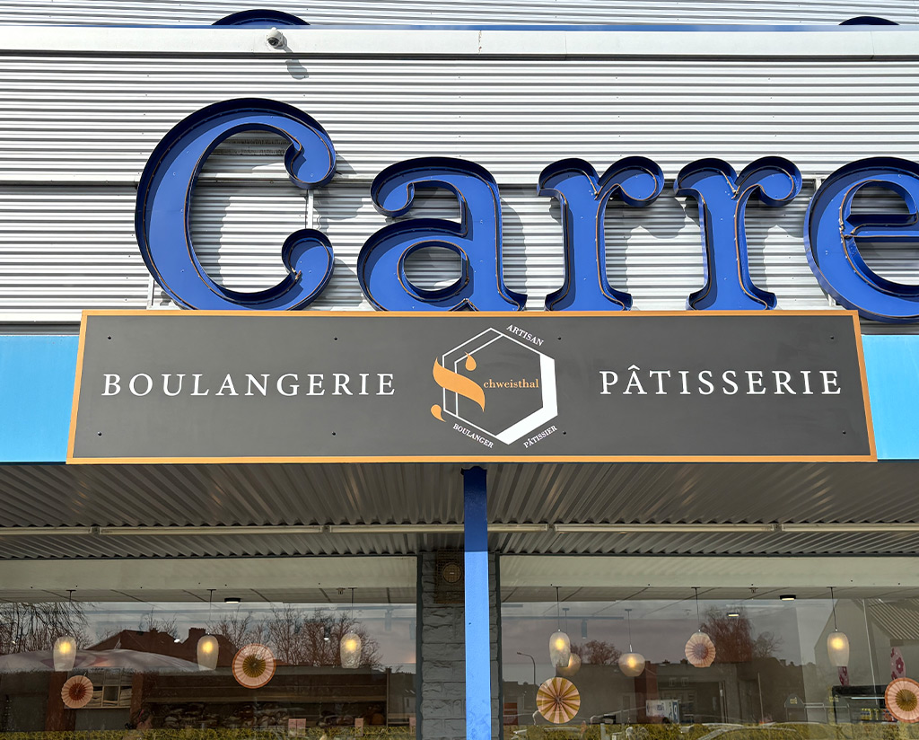 Habillage de la vitrine de la Pâtisserie Schweisthal à Arlon en Belgique : notre équipe a conçu et posé plusieurs vinyles sur toutes les vitres de la pâtisserie pour attirer l’attention des passants. Nous avons également installé une enseigne en dibond pour assurer une meilleure visibilité de loin.