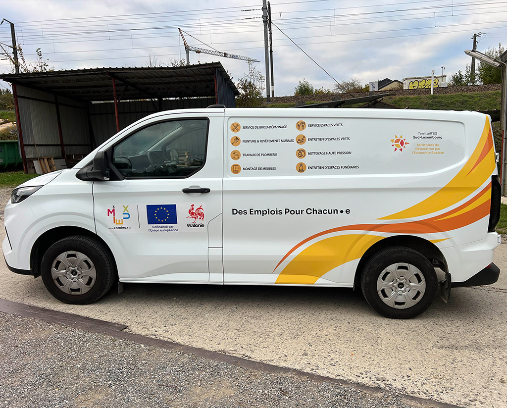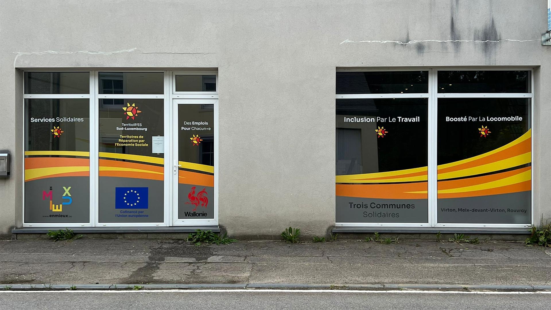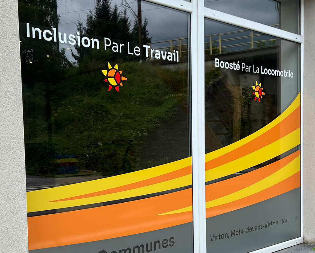 Nous avons récemment réalisé un projet de vitrophanie pour notre client TeritoiR’ES Sud-Luxembourg. Ce travail a consisté en la création d’un design sur mesure, à la fois coloré, visible et impactant, pour marquer les esprits dès le premier regard avec mélange de vinyles imprimés et de vinyles sablés.
